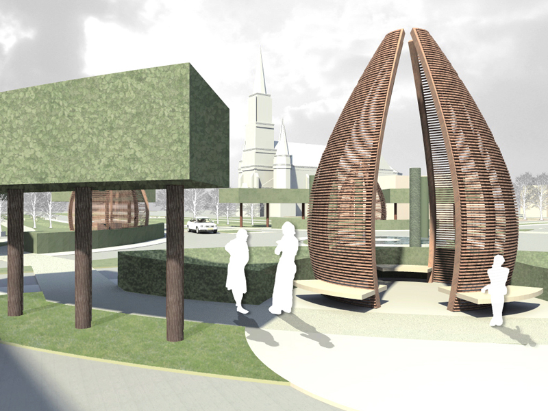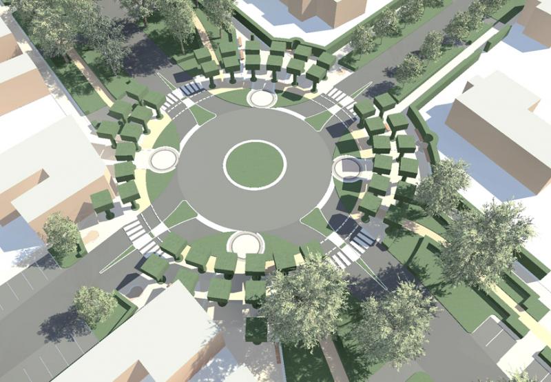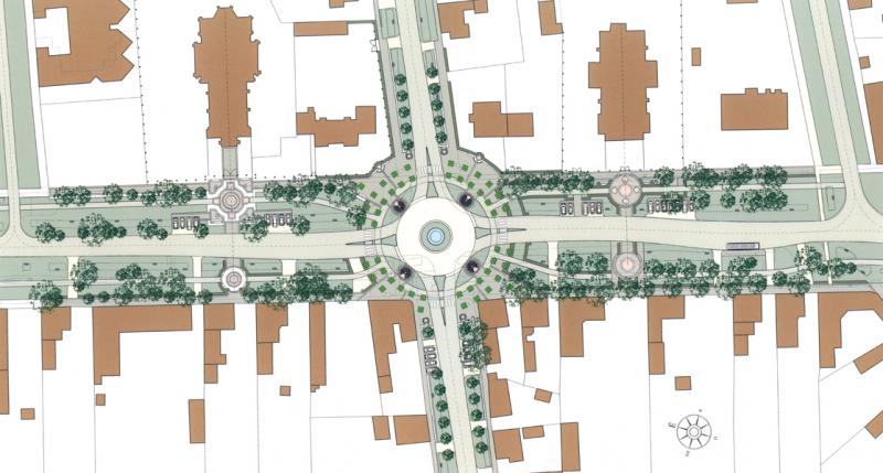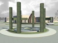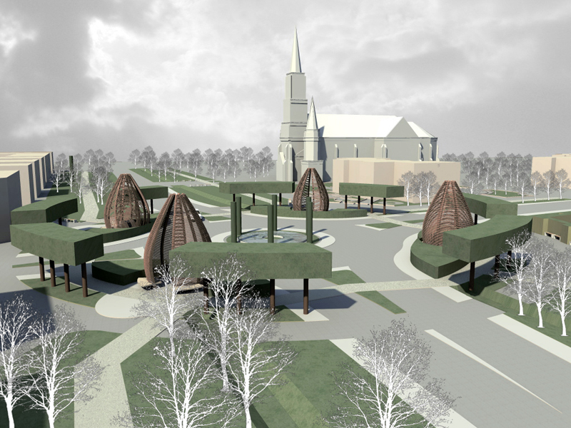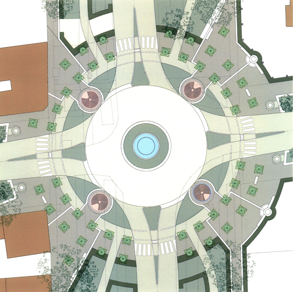 A nagy magyar Alföldön mind a reformáció, mind pedig az ellenreformáció (és/vagy a vallási türelem) megtette hatását: így egy-egy város központjában – egymáshoz meglehetősen közel – nem ritkán találtunk akár három templomot (néha akár többet) is, a nem is oly távoli múltban persze az obligát pártház és a tanácsháza szomszédságában. Az már sokkal ritkább, hogy a körzővel-vonalzóval megrajzolt új városrészeknek, az „újvárosoknak” is legyenek ilyen kitüntetett pontjai: Makón azonban éppen ez a helyzet. Egy szebb napokat látott katolikus és református templom áll, no nem szemben egymással, hanem egyetértésben, egymás mellett. | Az „alvóvárossal” nem is igen foglalkozna talán senki, csak hogy a város az epedve várt M43 autópálya megépülésével megszabadult végre a dübörgő átmenő kamionforgalomtól, s az ezzel járó fojtogató bűztől. Az autópálya forgalma azonban néhány kanyart megtéve, a szeméttelep mellett elhaladva éppen itt érkezik a városba. Némi értetlenséggel szokták Makót a körforgalmak városának is nevezni. Tetszik-e vagy nem ez a forgalomszervezési mód, mindegy is, mert bizonyított, hogy a megszokását követő időszaktól sokkal biztonságosabb, a be- és kivezető útszakaszokon a forgalom lassításának legbiztosabb módja. Így azután e spirituálisan is fontos helyre mi is körforgalmat terveztünk, s bár ezek Makón eddig is meglehetősen nagy változatosságot mutattak. a kör mint forma itt sokkal többet jelent egyszerű forgalomszervezésnél, hiszem már a görögök úgy tanították, hogy a kör – isteni forma. | A tervezés megkerülhetetlen elemei a templomok: a környezetük fölé magasan tornyosuló templomok az új városközpont emblematikus épületei, magasságuk, stílusuk ösztönző lehet a későbbi városközpont kialakulásában. A tervezett kompozició a két templom hosszanti tengelyétől közel azonos távolságban kitűzött körforgalom köré szervezett. A kerékpárúttal vegyes forgalmú csomópontból négy út indul és érkezik meg. A rotondó térrel tart egyensúlyt a két templom előtti, kisebb centrális tér. Ezeknek a templomelőtereknek a bővítései a Vásárhelyi utca túloldalára átnyúló pihenő terek. A templomok előtereinek megnyitása a Vásárhelyi utca felé, megérkező és találkozóhellyé álmodása alapvető tervezői gondolat volt. | A megvalósításra – a megbízó későbbi döntésének függvényében – három alternatívát dolgoztunk ki: • az újvárosi „Rotondó tér” Mindhárom variáció közös alapokra épül: a körforgalom adott geometriájába négy helyet jelöltünk ki, ahol befolyással lehet bírni a tér jelentésének és tartalmának meghatározásában.