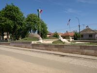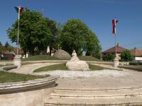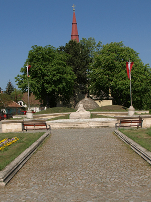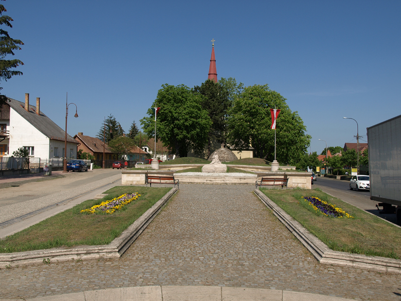 Veresegyház főterén az Ambrózy-Migazzy István püspök által építtetett templom mögött alakítottuk ki Kő Pál szobrászművész II. világháborús szobrának környezetét. Oly módon, hogy a meglévő lourdes-i grotta kupolás záródásához két oldalról a hármas halmot szimbolizáló terepplasztika került. Így a teplomkert és a városi köztér funkcionálisan elválsztásra került, de vizuálisan egybetartoznak. A zászlót hímező, katonaládán ülő asszony szobra (Az anya) köré enyhén emelkedő inkrusztatív kősétányt terveztünk. A szobor előterében gyertyák elhelyezésére alkalmas kőfelületet alakítottunk ki. Az avatás éve: 1996 |