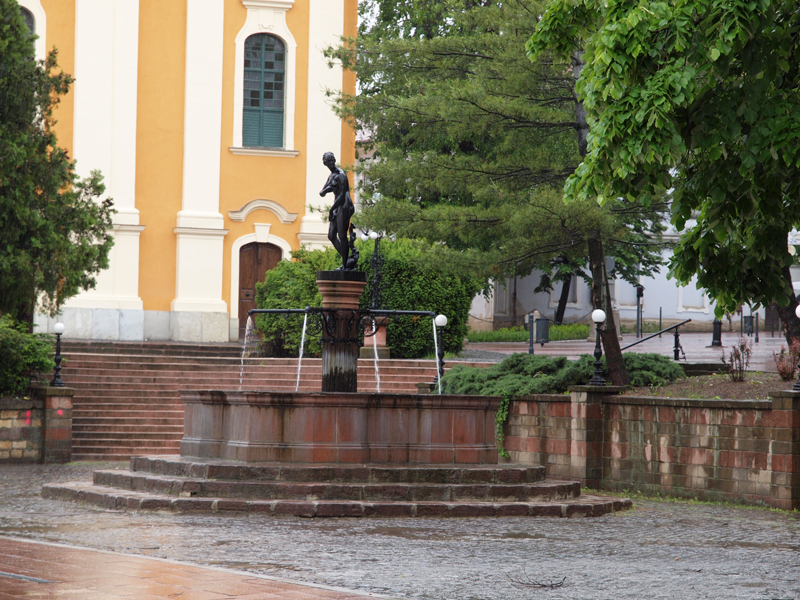 Sátoraljaújhely szebb napokat látott kereskedőváros volt a Sátor-hegy lábánál, a trianoni szerződés azonban a magyar-cseh határra száműzte. Szinte zárt határváros lett. A piacutcás, orsós főtér meghatározó épületei a templom és a barokk városháza, a gazdag kovácsoltvas installációkkal díszített lakótömb épületei. Kakukktojásként pöffeszkedett a modern pártház, s környezetidegennek hatott a támfalakkal és absztrakt formájú parterrekkel túlszabdalt szocreál tér. Különleges lehetőség volt a természetes forrásvízzel táplált kút újraélesztése. A korábbi kutat képeslapokról ismertük, amelynek egyes részletei szétszórva, darabokban ismertek voltak. | A kutat, amely a Kossuth szobor helyén állt, 1775-ben építették, hogy ha tűzvész ütne ki a városban, a vizével olthassák azt. De sokan innen hordták otthonaikba az ivóvizet is. Egykor még a fogházban, a börtönben is a Dörzsik vizét használták. Most már csak itt, a kifolyásnál iható. A korábbi kútszobor sorsáról hitelt érdemlő adatok nem álltak rendelkezésünkre. A különleges öntött- és kovácsoltvas munkák, kerékvetők, cégérek, erkélyrácsok, kandelláberek nagy száma azonban elsőrendű tárgyi kultúrát feltételezett, ami azt sugallta, hogy kutatásainkat az Iparművészeti Múzeum Ötvös osztályán folytassuk. Itt rá is akadtunk egy, az újhelyi nép körében csak "Vas Manciként" aposztrofált, bár hivatalosan Nimfás kútnak nevezett kútszoborra hajazó alkotásra. | Egy öntöttvas női aktra, amit a korabeli sajtó már "Medici Vénuszként" nevezett meg. Úgy ítéltem meg, hogy a szobor megfelel a kutat díszítő régi alkotás arányainak, így kérésemre a Múzeum tartós letétbe helyezte a szobrot a város főterén, két, szintén innen származó kandelláberel együtt. A tér rendezésével megszünt annak túltagoltsága: eltűntek a kiszolgált lépcsők, támfalak, ágyásszegélyek. A szokásos pénzhiány és az építőanyagok akkori szűk választéka csak egy visszafogott környezetrendezést tettek lehetővé. A közelmúltban megnyilt pénzcsapok azonban már nem a mi munkánk méltó befejezését szolgálták. |